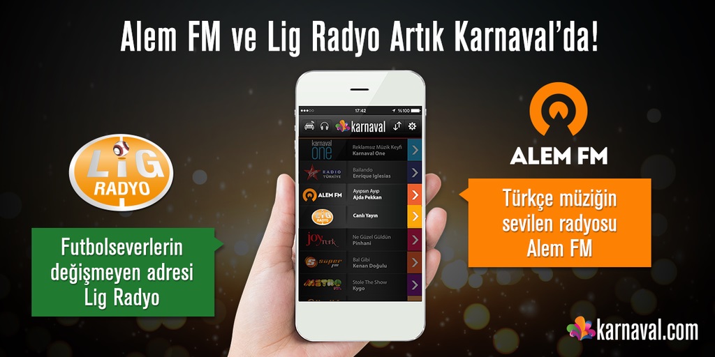Türkçe Pop müziğin sevilen adresi Alem FM ve futbol severlerin müdavimi olduğu Lig Radyo artık Karnaval’da!