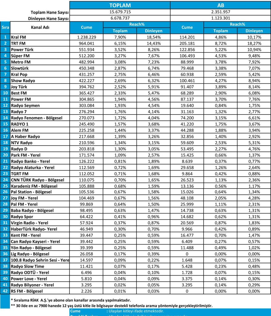 Aralık 2016 tarihine ait radyo reyting sonuçları açıklandı.
