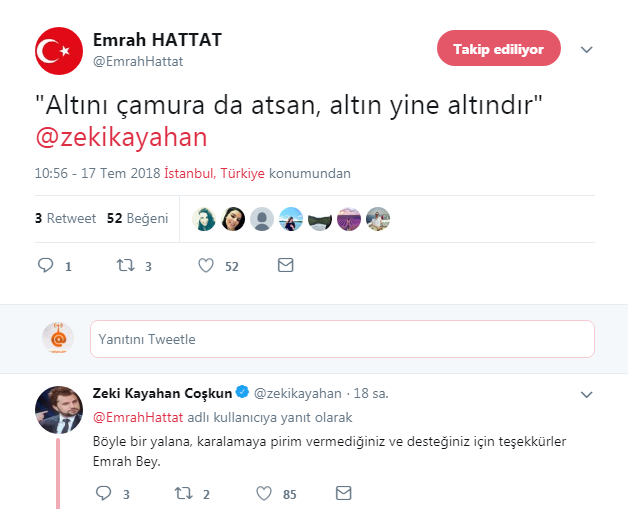 Bunun üzerine ünlü radyocu Emrah Hattat’a şu tweeti attı. Coşkun; “Böyle bir yalana, karalamaya pirim vermediğiniz ve desteğiniz için teşekkürler Emrah Bey.” dedi.