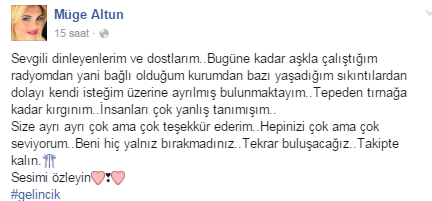 Hafta içi her akşam 18:00 – 20:00 saatleri arasında Damla FM’de yayın yapan Gelincik, ayrılık haberini sosyal medya hesabından paylaştı.