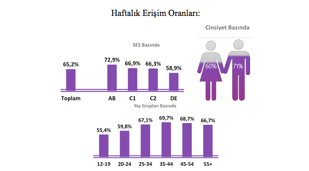 -Cinsiyete göre radyo dinleme oranları kadınlarda da erkeklerde de değişiklik göstermedi. Kadınların haftalık radyo erişim oranı yüzde 60 iken bu oran erkeklerde yüzde 71 oldu.