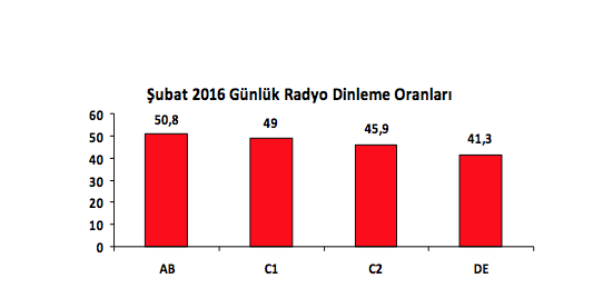 URYAD A.Ş ve Nielsen’in hazırladığı; her ay en az 5 bin hane ve 7500 birey ile yapılan “Radyo Dinleyici Ölçümü Araştırması”nın günlük ve haftalık bazda Şubat 2016 sonuçlarına göre 20-24 yaş arası gençlerin radyo dinleme oranları attı.