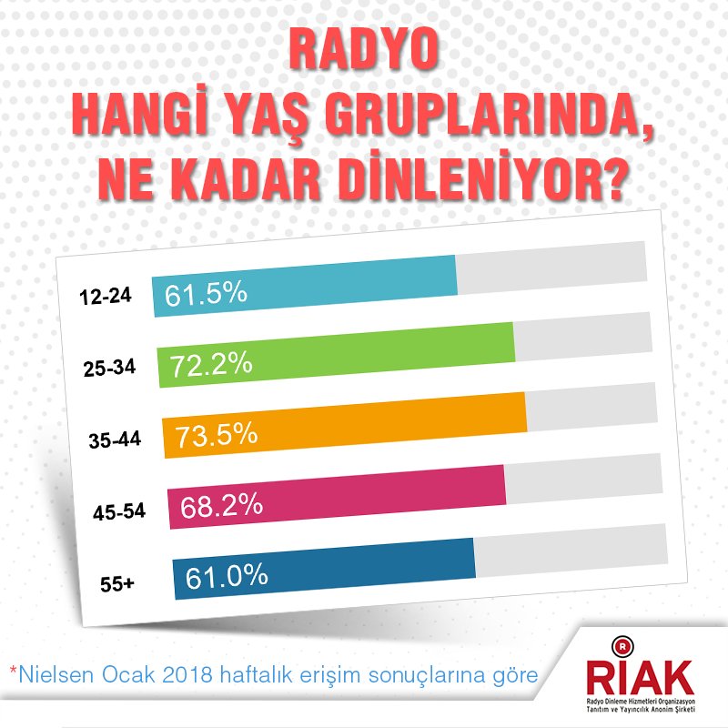 Nielsen ve RİAK sosyal medya hesaplarından paylaştığı görsel istatistikte yaş aralığına göre radyo dinleyicileri yer alıyor.