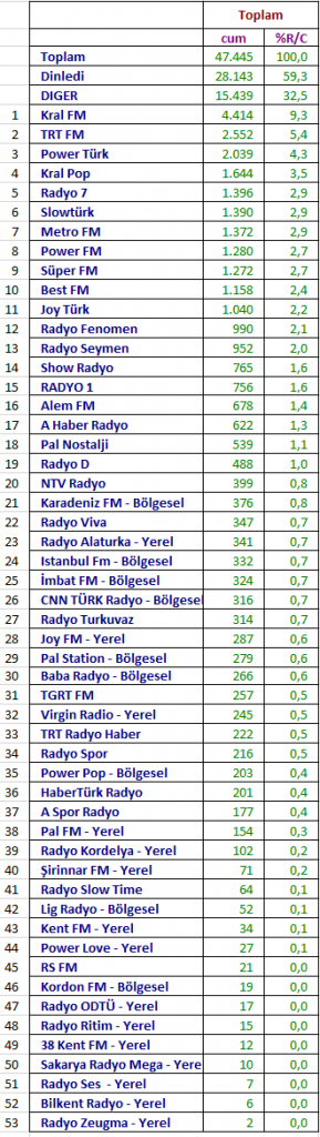 Türkiye genelinde en çok hangi radyoların ve radyo programlarının dinlendiğini sorgulayan araştırmanın sonuçlarını Radyocular.com olarak sizlerle paylaşıyoruz.