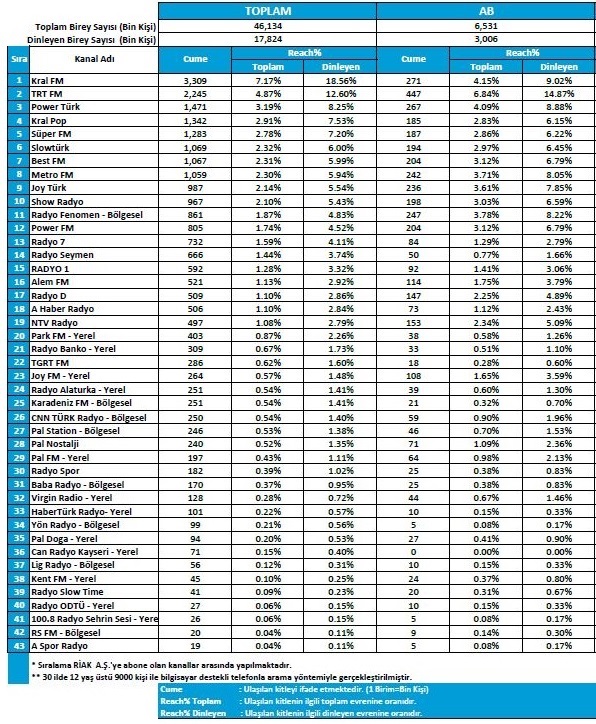 Türkiye genelinde en çok hangi radyoların ve radyo programlarının dinlendiğini sorgulayan araştırmanın sonuçlarını Radyocular.com olarak sizlerle paylaşıyoruz.