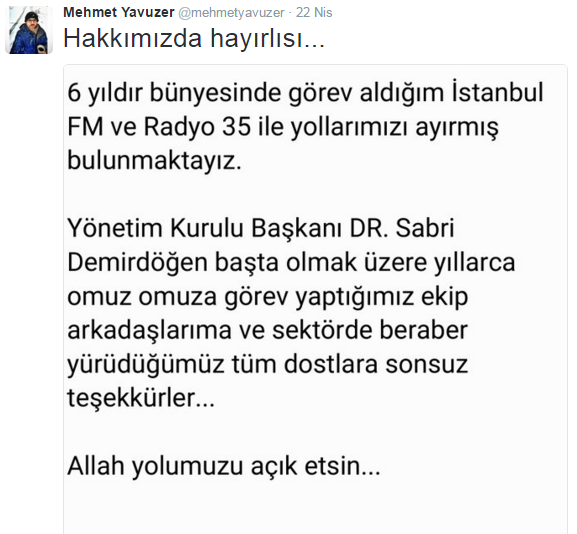 İstanbul FM ve Radyo 35’te çeşitli görevler alan başarılı programcı Mehmet Yavuzer, ayrılık haberini sosyal medya hesabından duyurdu.
