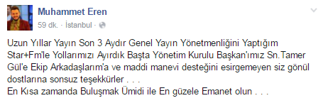 Uzun yıllar Star FM’de program yapan ve son 3 aydır da radyonun Genel Yayın Yönetmenliği görevini yürüten Muhammet Eren, görevinden ayrıldığını duyurdu.