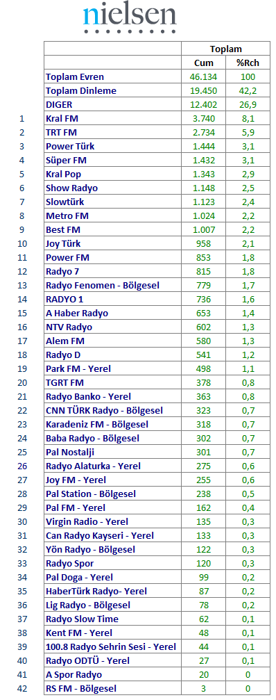 RİAK & ve Nielsen ortaklığıyla her ay düzenli yapılan araştırma sonucu ortaya çıkan sonuç aşağıdadır.