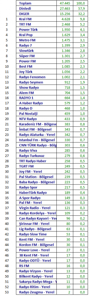 Türkiye genelinde en çok hangi radyoların ve radyo programlarının dinlendiğini sorgulayan araştırmanın sonuçlarını Radyocular.com olarak sizlerle paylaşıyoruz.