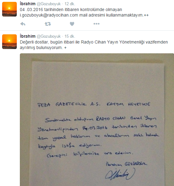 Radyo Cihan Genel Yayın Yönetmeni İbrahim Gözüboyuk Kayyım heyetine dilekçe yazarak istifa ettiğini dile getirdi.