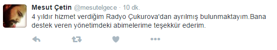 4 yıldır görev yaptığı Radyo Çukurova’dan ayrıldığını sosyal medya üzerinden duyuran Mesut Çetin, emeği geçen herkese ve yönetimi teşekkürlerini iletti.
