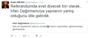 Kanal D’de sabah haberlerini sunan İrfan Değirmenci’nin referandumda “hayır” oyu kullanacağını açıkladıktan sonra görevine son verilmişti.