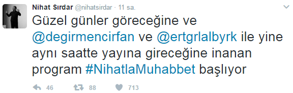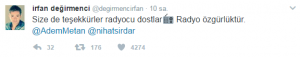 İrfan Değirmenci’nin görevine son verilmesinin ardından Show Radyonun ünlü programcısı Nihat Sırdar ve Alem FM’in başarılı programcısı Adem Metan’dan destek geldi.