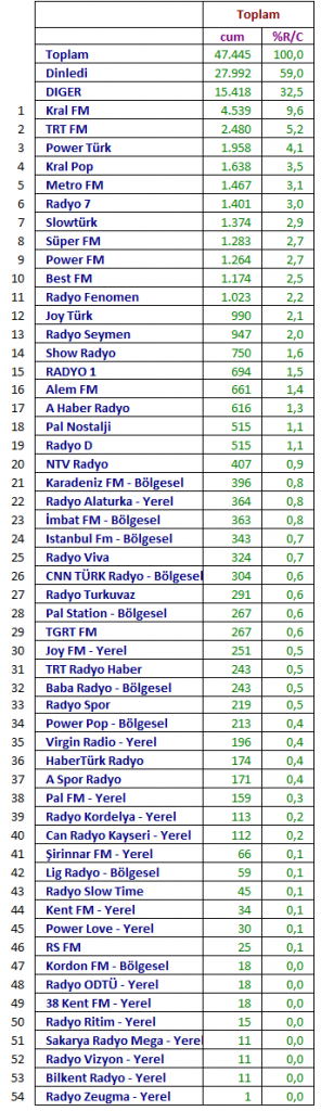 Türkiye genelinde en çok hangi radyoların ve radyo programlarının dinlendiğini sorgulayan araştırmanın sonuçlarını Radyocular.com olarak sizlerle paylaşıyoruz.
