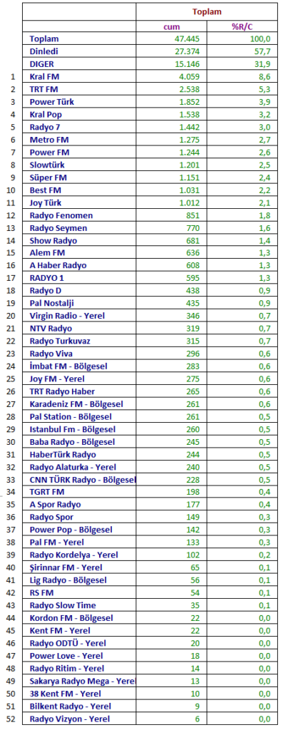 Türkiye genelinde en çok hangi radyoların ve radyo programlarının dinlendiğini sorgulayan araştırmanın sonuçlarını Radyocular.com olarak sizlerle paylaşıyoruz.