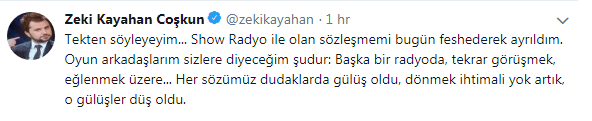 Zeki Kayahan Coşkun’un görevinden ayrılmasıyla birlikte hangi radyo ile anlaşacağı veya görüştüğü bilinmiyor.